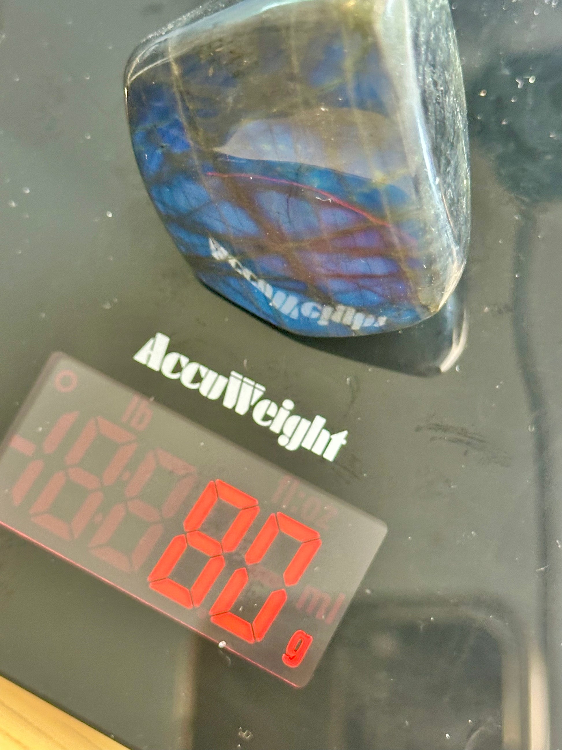 This stunning blue flash labradorite freeform weighs 80g and measures 6cmx3.5cm. Known for its iridescent sheen of colours.
